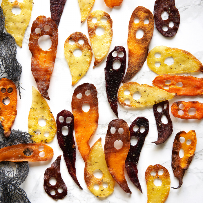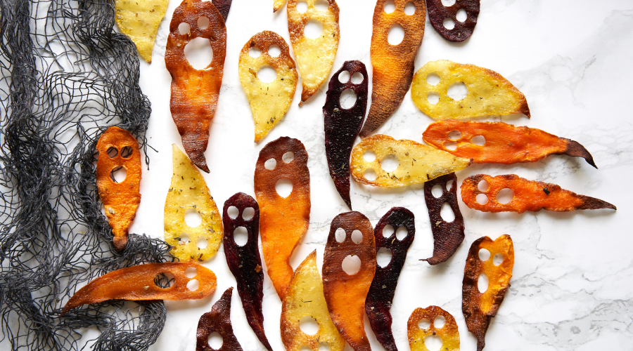 Rudenīgs našķis Helovīna ballītei - krāsnī cepti dārzeņu čipsu “spociņi"