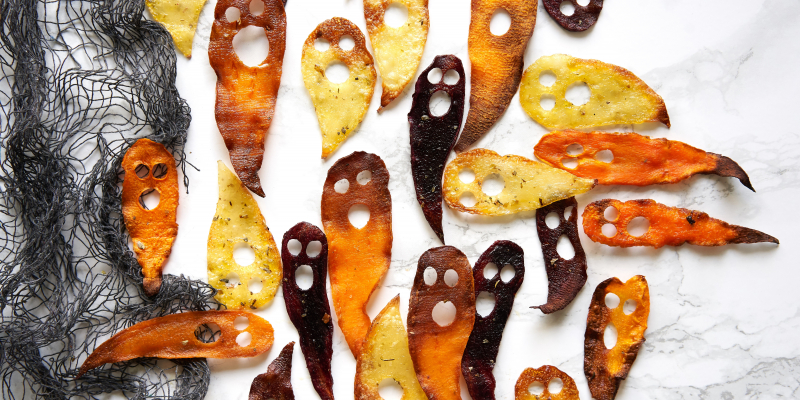 Rudenīgs našķis Helovīna ballītei - krāsnī cepti dārzeņu čipsu “spociņi"